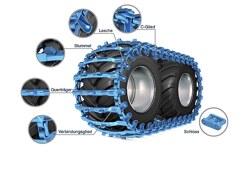 Jedes pewag bluetrack Band besteht aus einem Querträger mit Stummeln, Schmiedeglieder oder auch connecting links genannt, Schlösser, C-Glieder und der Lasche.